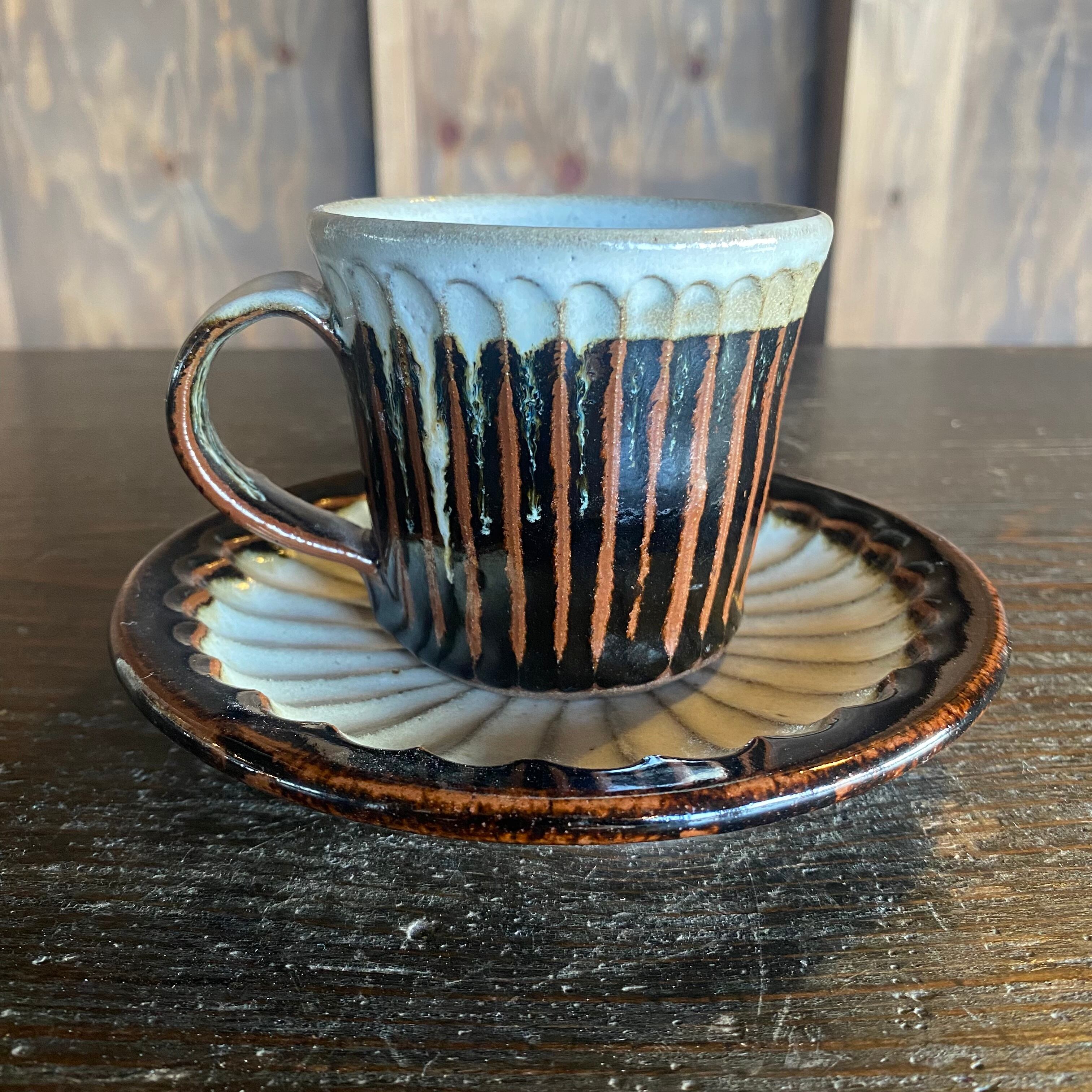 丹波焼 俊彦窯 カップ&ソーサー 鎬手 掛け分け