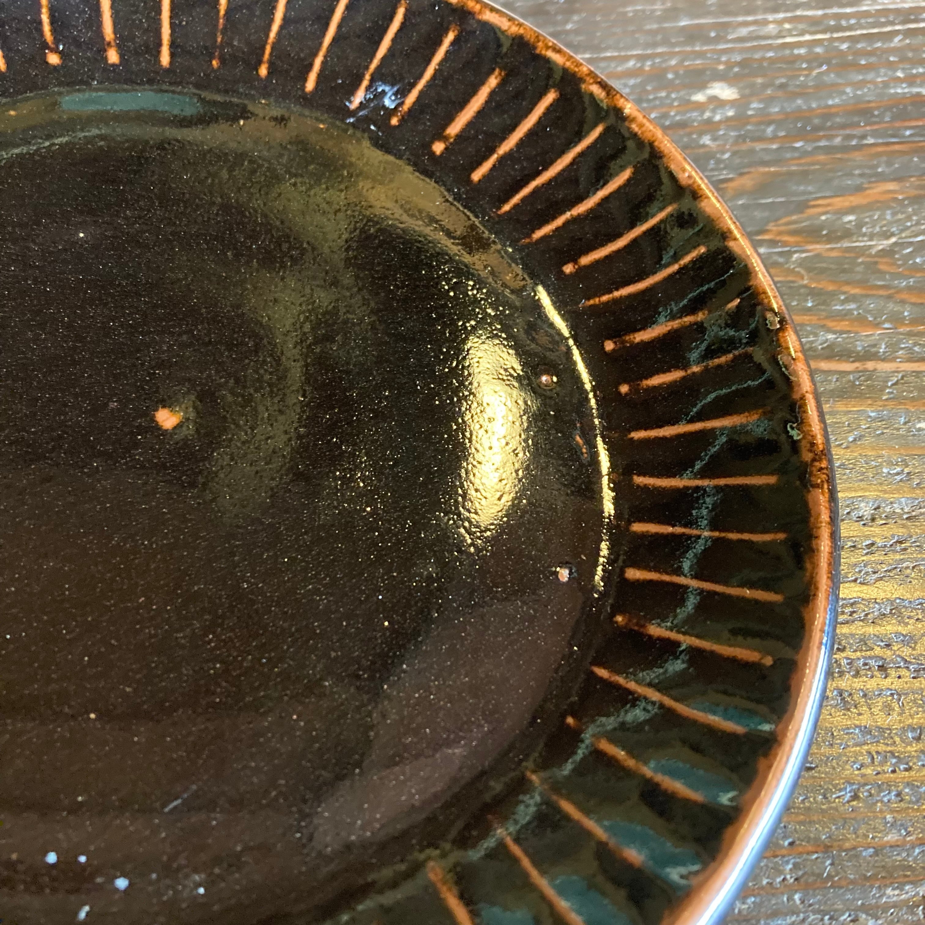 丹波焼 俊彦窯 7寸皿 フチ鎬手 黒釉